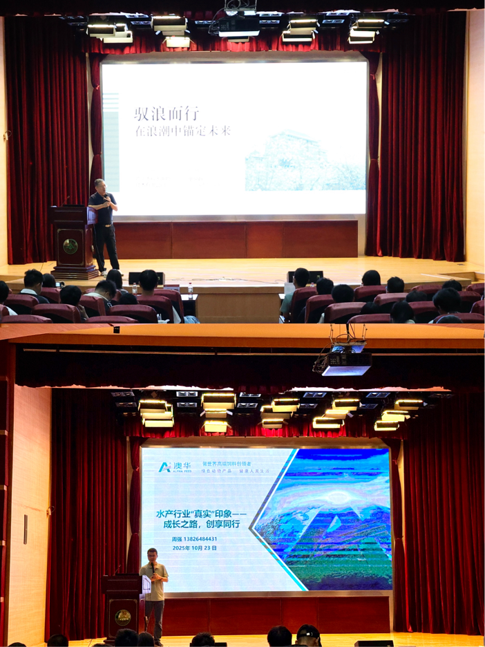 随后,澳华集团价值交付中心总监周强带来了主题为“水产行业‘真实’印象—成长之路,创享同行”的精彩报告。他聚焦当代青年对专业与职业选择的思考,凭借对水产行业的深度洞察,帮助在场学子打破认知误区、深化专业理解,为新生明晰未来发展方向提供了极具价值的指导。