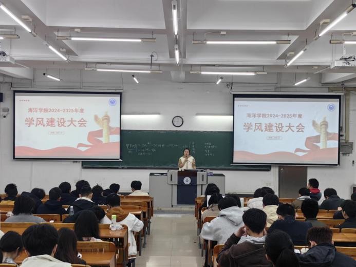 2025年3月7日上午,海洋学院2024-2025年度学风建设大会于教三312教室召开,学院全体本科生及各年级辅导员参会。本次大会以总结过去一年的学业成果,表彰先进典型,并部署新学年学风建设计划。
