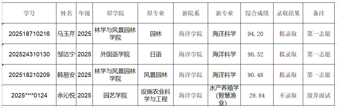 海洋学院关于2026年本科生转专业(转入)考核结果的公示