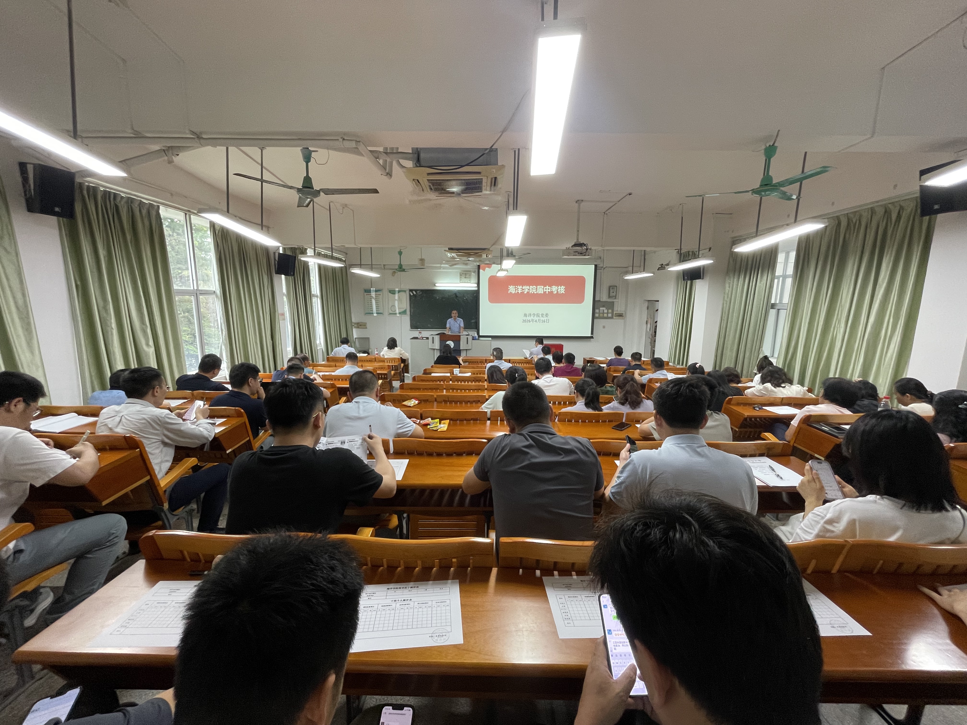 2026年4月16日下午,海洋学院在教一305室召开领导班子届中考核会议。会议由学院党委书记闫笑久主持,全体教职工参加。学校组织部考核组林楠、叶景欣同志到会。